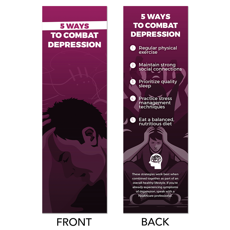 The 5 Ways to Combat Depression Bookmarks slip gentle guidance right between the pages—because sometimes a tiny reminder is all it takes to brighten a heavy day. Designed for readers of all ages, these double-sided depression prevention bookmarks deliver five practical strategies in a calm, friendly format that fits seamlessly into daily routines. Each bookmark features simple tips like exercising, prioritizing sleep, and more.
