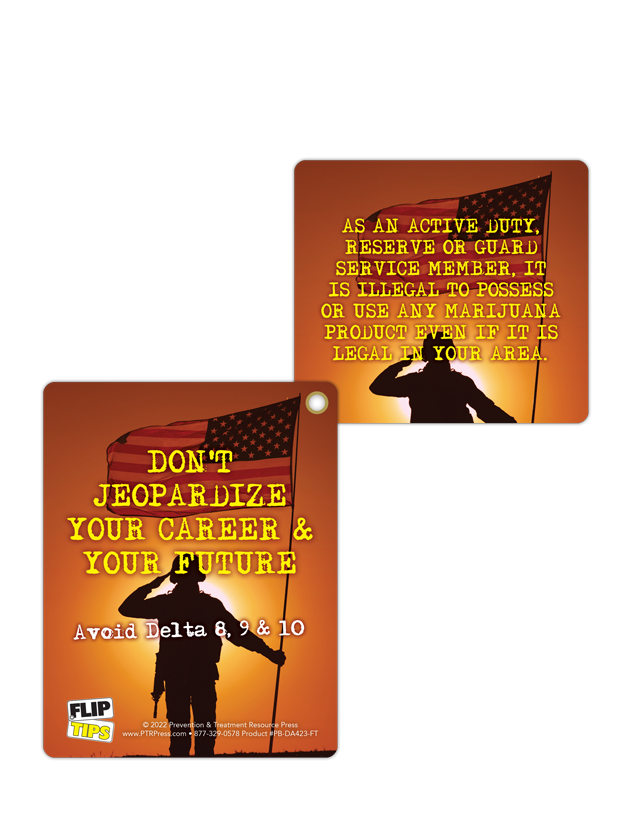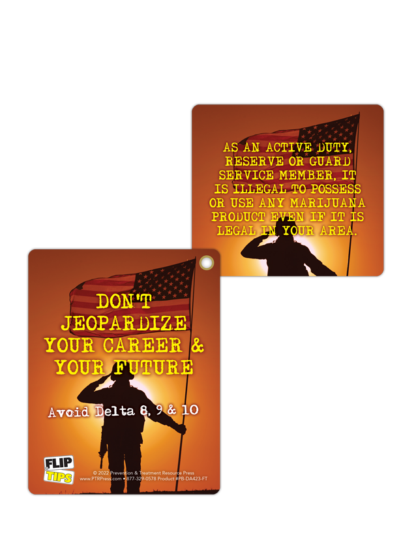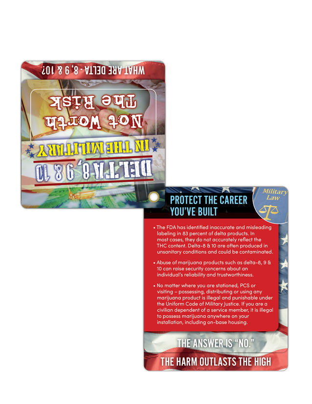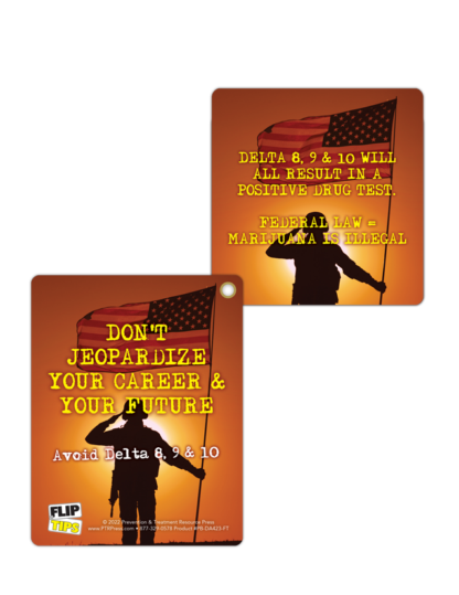 These Delta-8, 9 & 10 In The Military: Not Worth The Risk Flip Tips don’t sugarcoat the facts. Specifically designed for service members and military leadership, this handy flip guide cuts through the confusion about Delta-8, Delta-9, and Delta-10 THC products—explaining why “hemp-derived” doesn’t mean harmless or allowed.