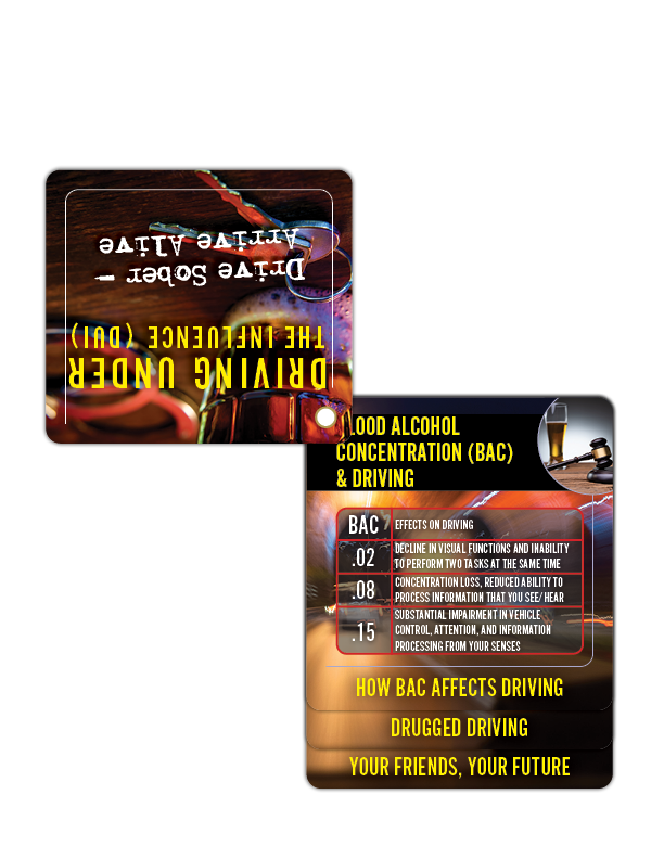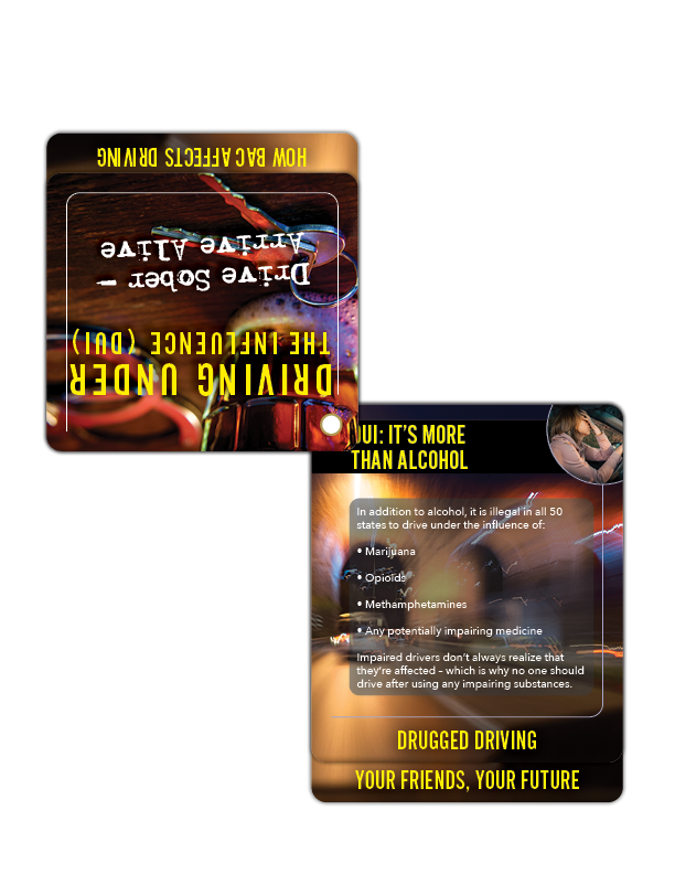 Whether it’s understanding the consequences of DUI, promoting responsible drinking habits, or highlighting the impact on lives, every flip becomes a tool for preparing individuals and communities to make responsible choices, fostering a culture of safe driving and saving lives on our roads. It’s a continuous source of valuable information at your fingertips. And with space to customize the back panel with your logo and message, it keeps your prevention efforts visible long after the event ends.