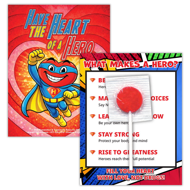 The superhero design matches the full Have the Heart of a Hero product line, so pairing these with matching drug prevention materials keeps the campaign visually consistent and the message reinforced across every touchpoint.