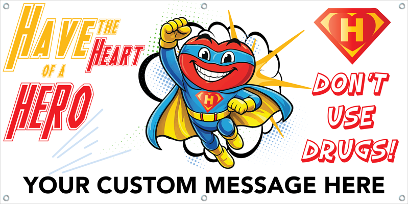 The “Have the Heart of a Hero – Don’t Do Drugs” Banner brings the full superhero treatment to your walls, stage, entrance, or wherever your program needs a visual that commands attention without saying a single word out loud. Bold graphics, bright colors, and a message big enough to read from the back of a gymnasium.