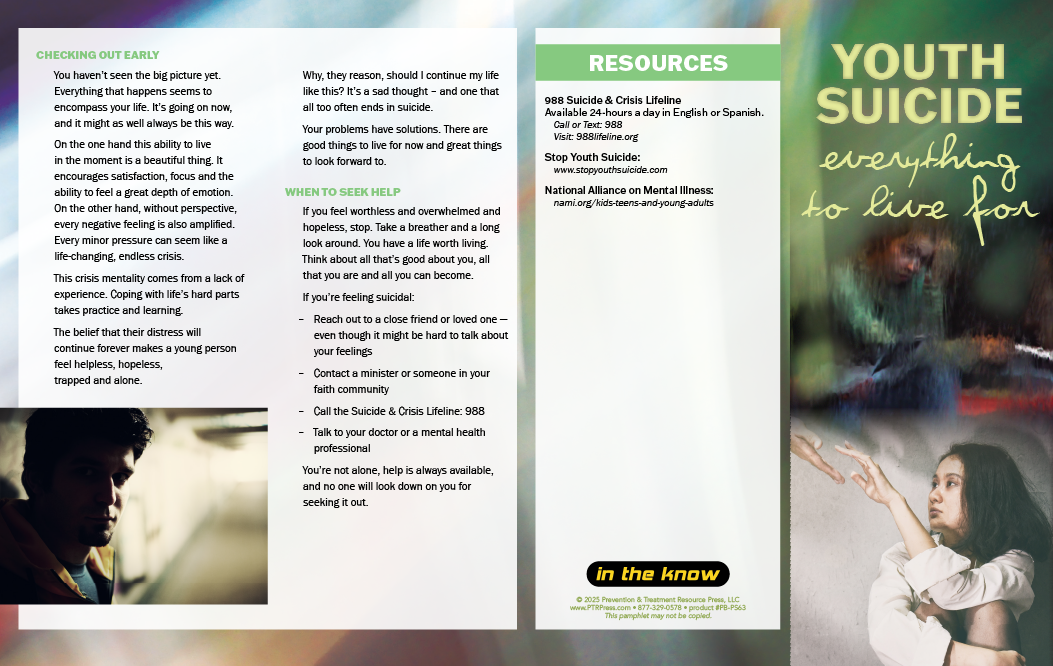 The Youth Suicide Prevention Pamphlets are ideal for schools, youth programs, and community outreach efforts. They help spark lifesaving conversations and reminding every young person that their story still has chapters waiting to be written.