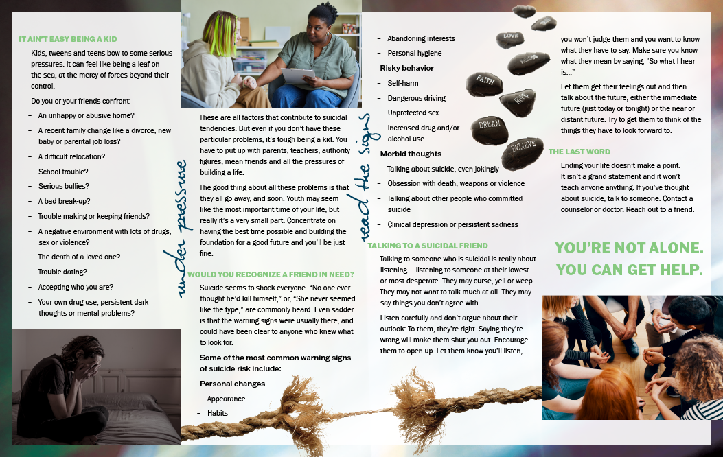 With an emphasis on connection and open communication, these pamphlets encourage young people to reach out, listen, and stand by those in need. They remind every reader that no one has to face their darkest moments alone, and that asking for help is a sign of strength, not weakness.