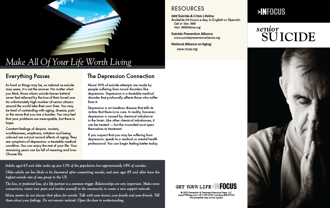 These Senior Suicide Prevention Pamphlets open the door to vital conversations about mental well-being among older adults. This resource helps readers recognize the unique challenges seniors may face—such as loneliness, chronic illness, loss, or feeling like a burden—and provides insight into how these factors can increase suicide risk.