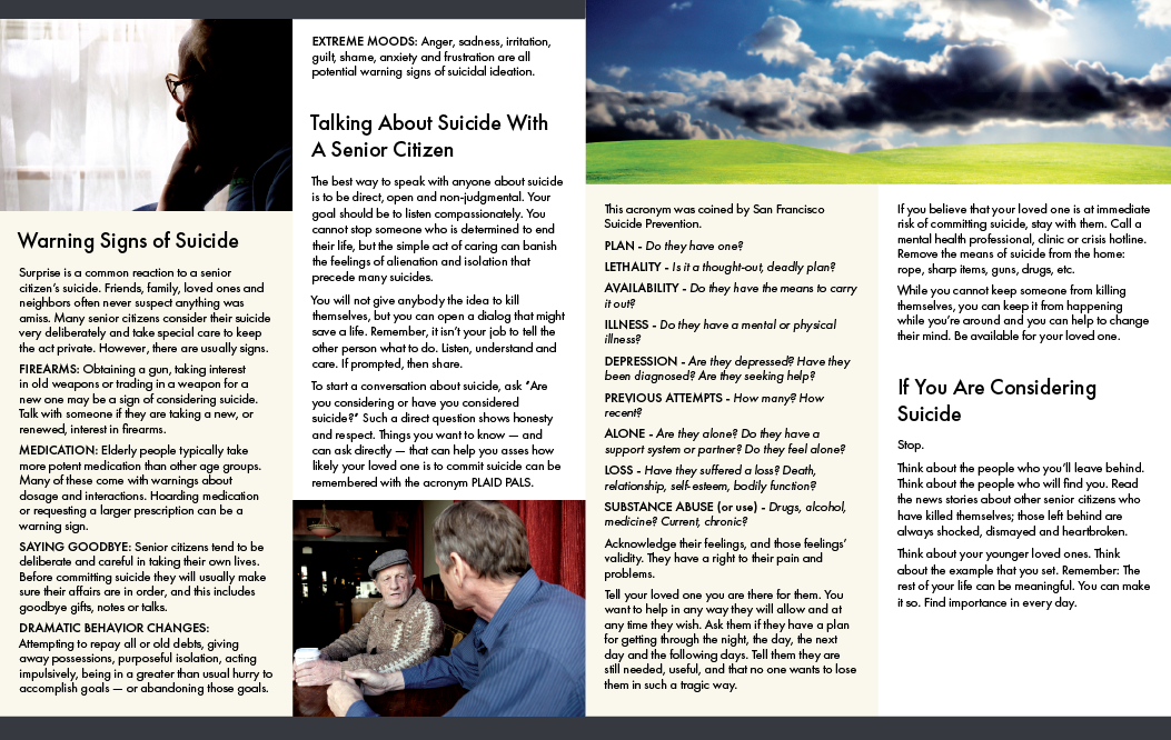 Inside, you’ll find practical guidance for recognizing warning signs, understanding risk factors, and approaching sensitive conversations with empathy and respect. The pamphlet also offers valuable tips on how to talk about suicide with an older adult, emphasizing that listening, validating feelings, and encouraging help-seeking can truly save lives.