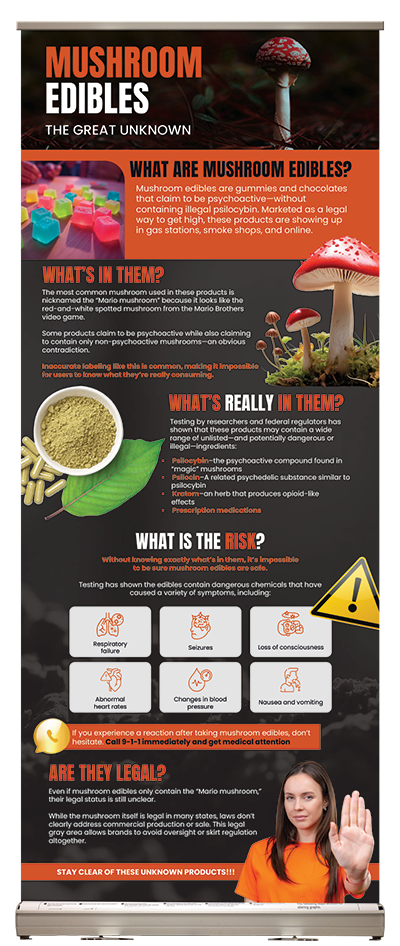 From confusing packaging to unpredictable side effects, this retractable display highlights what makes mushroom edibles so dangerous—especially for young people. Whether they’re disguised as gummies or chocolates, these “magic” treats often come with more risk than anyone bargained for.