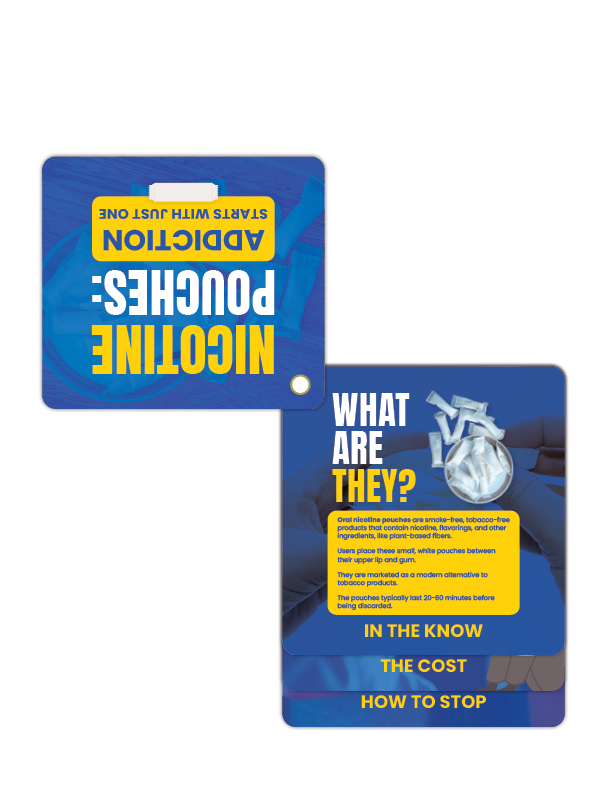 Looking to take a stand against nicotine pouches? Our Nicotine Pouches: Addiction Starts with Just One Flip Tips are the perfect tool for your next event or outreach initiative. Packed with fast facts, these Flip Tips break down what nicotine pouches are, how they work, and the dangers they pose.