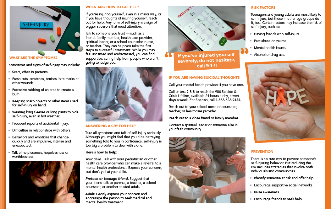 Inside, readers will learn about common forms of self-injury, potential underlying causes, and symptoms that may indicate someone is struggling. The pamphlet also explains how self-harm differs from suicidal intent while emphasizing that both require attention, care, and professional support.