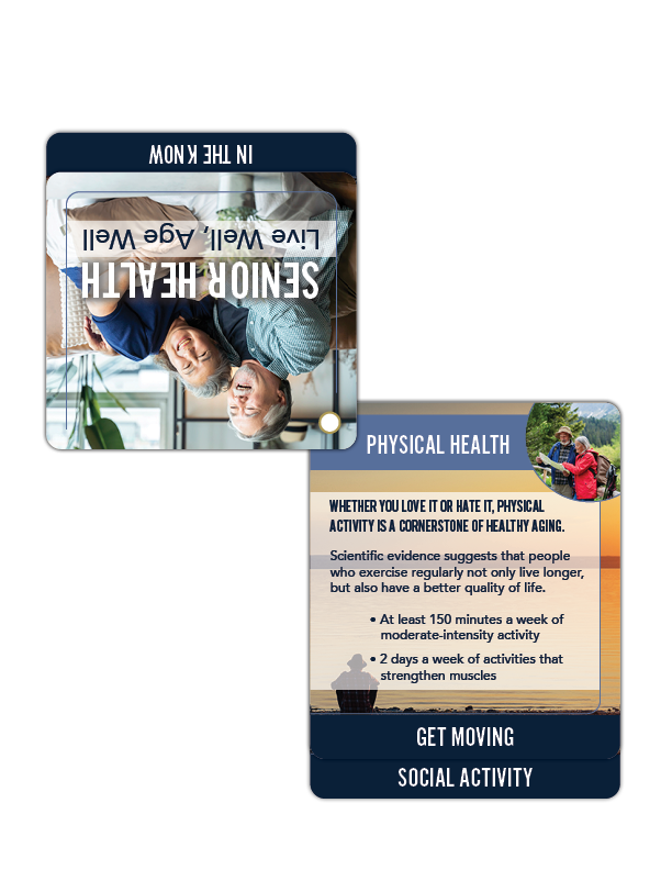 Dive into the fountain of vitality with our Senior Health Flip Tips. They’re the ultimate guide for hosting vibrant health and wellness events. Flip through a curated collection of rotating fact cards, each serving up bite-sized information and vibrant visuals to inspire seniors to live their best lives.