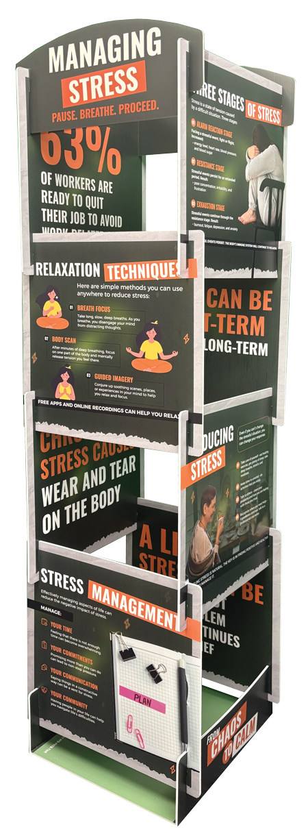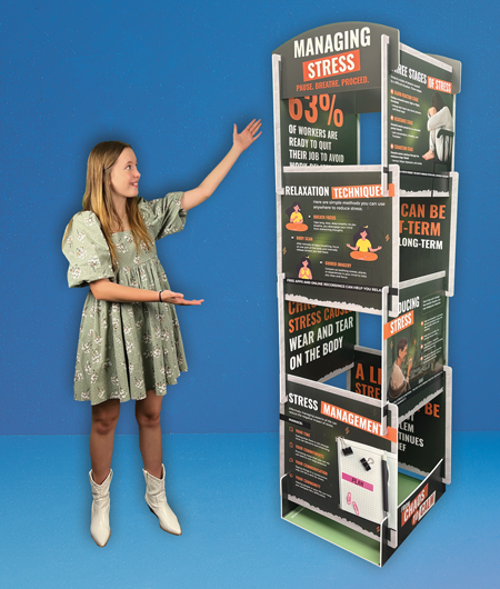 Looking to stack your event with more awareness tools? This Stress Management Info Tower pairs perfectly with our Presentation Display, Rack Cards, and Flip Tips!