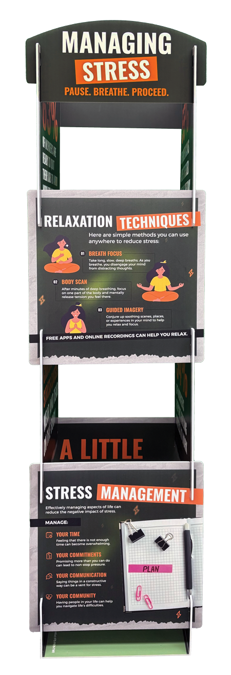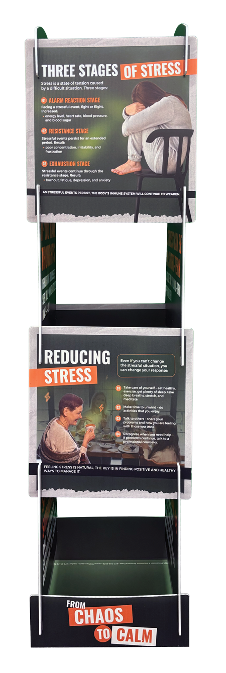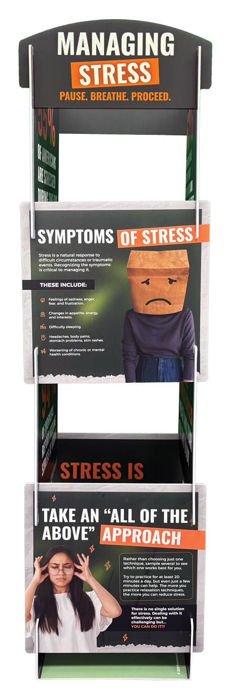 Looking to stack your event with more awareness tools? This Stress Management Tabletop Info Tower pairs perfectly with our Presentation Display, Rack Cards, and Flip Tips!