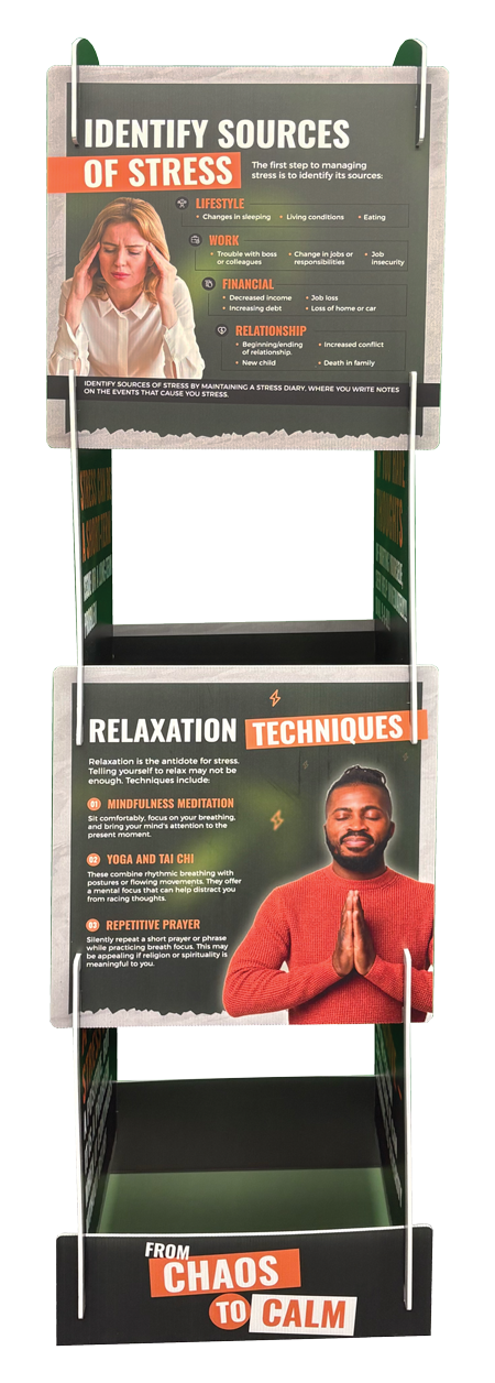 Deep breath in… and release. The Managing Stress Tabletop Info Tower delivers the perfect reminder that calm can fit right on your table. Compact but commanding, this stress management tabletop tower brings awareness, relaxation techniques, and a sense of mindfulness to any event or workspace.