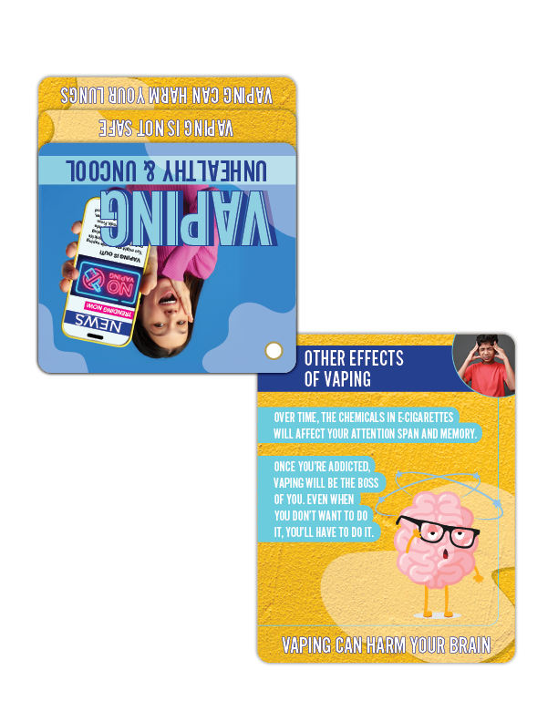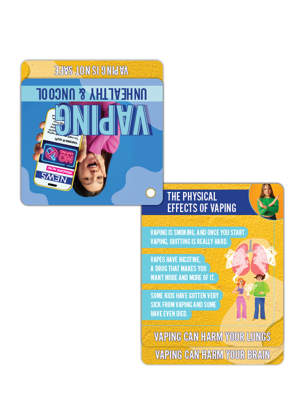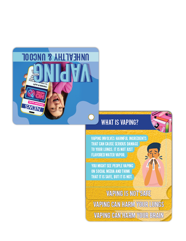 Hand them out at vaping prevention events, school assemblies, or during community outreach programs. Every flip becomes a driving force in advocating for informed choices, protecting kids, and keeping vaping out of the cool zone.