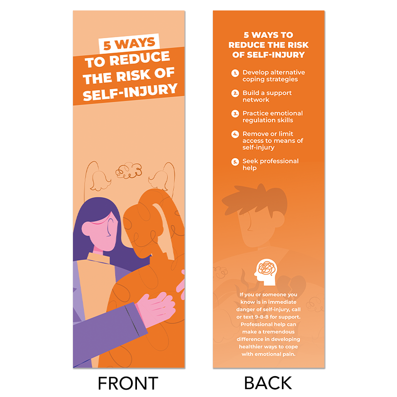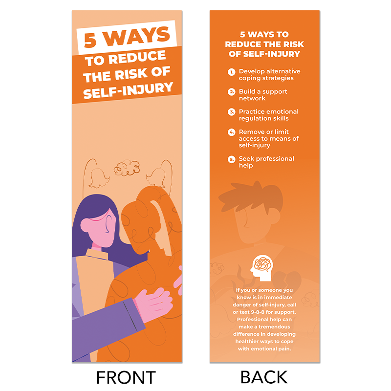 The 5 Ways to Reduce the Risk of Self-Injury Bookmarks are a compact, double-sided resource designed to provide people with practical guidance for identifying and managing self-harming behaviors. Perfect for classrooms, counseling centers, or youth outreach programs, these self-injury bookmarks give essential prevention strategies in a clear, approachable format.